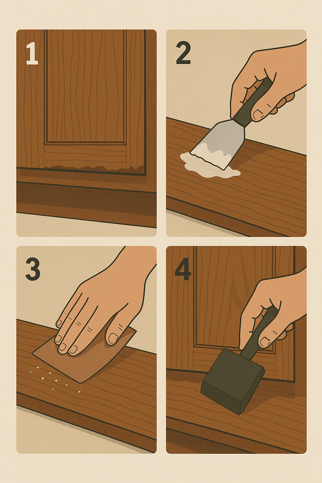 These tools and materials are chosen to make the repair approachable, affordable, and durable. With just sandpaper, filler, and the right finish, you’ll be able to bring back the warmth and polish your cabinets once had. Add in the optional sealants and liners, and you’re setting yourself up for long-term success while saving thousands compared to a full replacement.